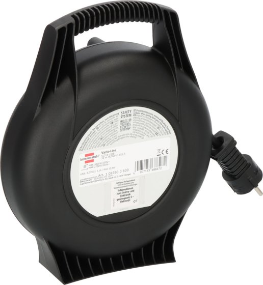 Die Vario-Line Kabelbox 3-fach mit USB-Ladefunktion und einer 10m Kabellänge in der Farbe schwarz verfügt über ein schlagfestes Gehäuse aus Spezial-Kunststoff. Der ergonomisch geformte Tragegriff und der großflächige Standfuß sorgen für eine perfekte Standfestigkeit und erleichtern den Transport. Hervorzuheben sind die zwei USB-Ladebuchsen, die staub- und schmutzgeschützt sind und einen maximalen Gesamtladestrom von 2,10A bieten. Die Mini-Kabeltrommel für innen mit erhöhtem Berührungsschutz eignet sich perfekt für die Verwendung im Haushalt. Sie überzeugt zudem durch folgende Eigenschaften: