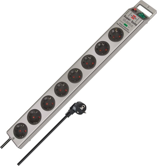 The Super-Solid extension lead 8-way and 2.5m cable impresses with its quality and safety in all areas. A special cable entry opposite the switch makes this power strip particularly easy to use, e.g. under the desk. Multiple plugs with practical fastening eyes for wall mounting and rubber feet for a secure stand. It not only has increased protection against accidental contact, but also impresses with the following features: