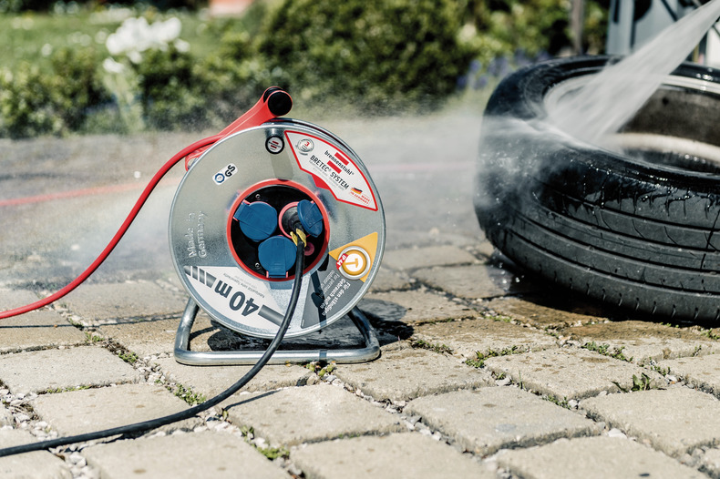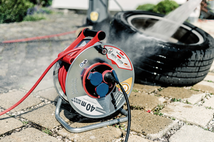- Innovative and ergonomic cable guide handle "cable pilot" for perfect cable-management during winding. Handle commutes on both sides and allows easy carrying and cable storage. For right and left handed easy to rewind.