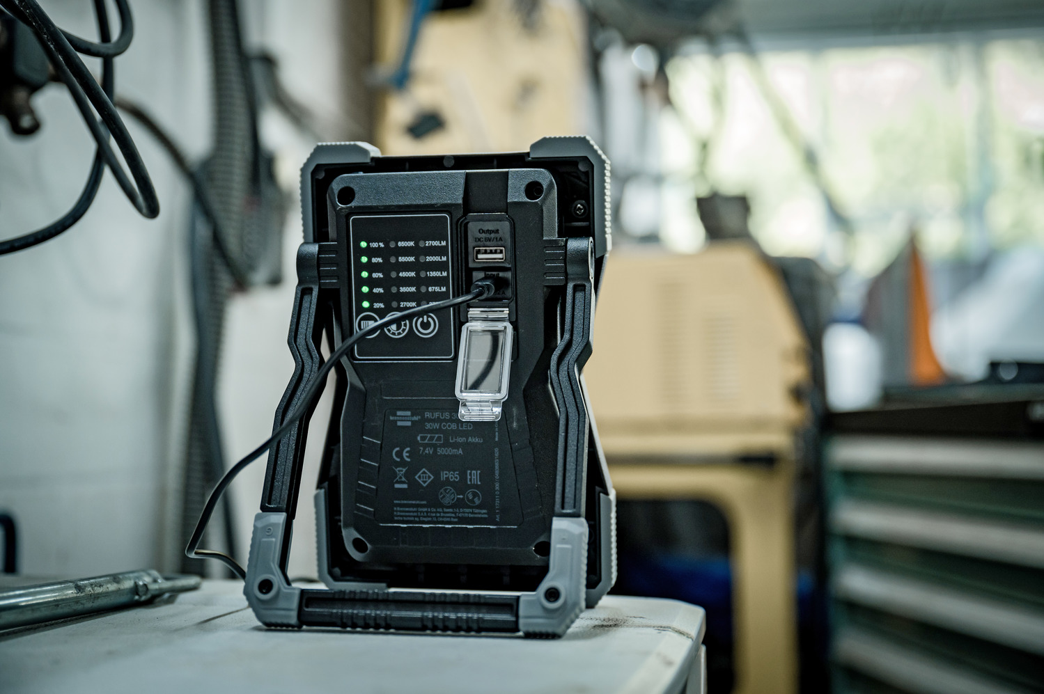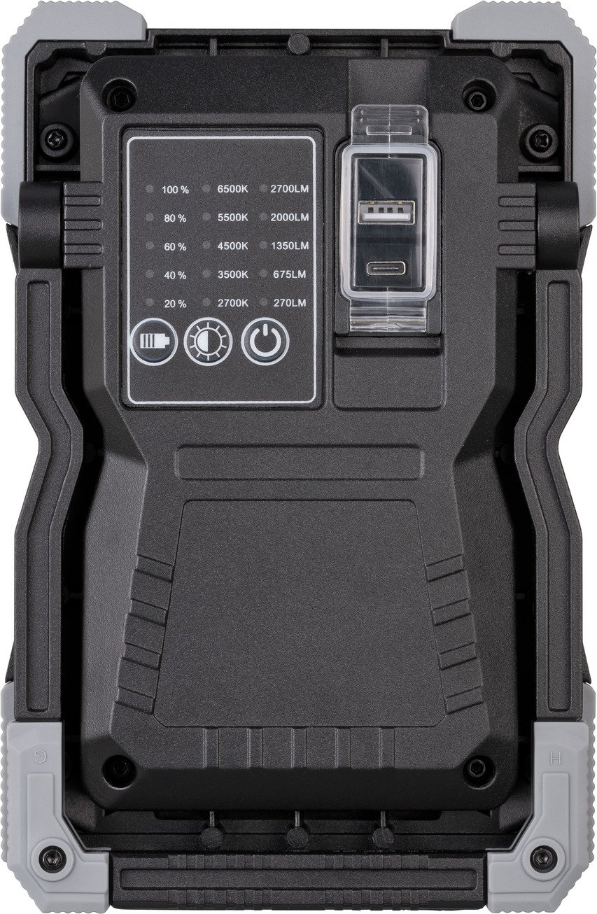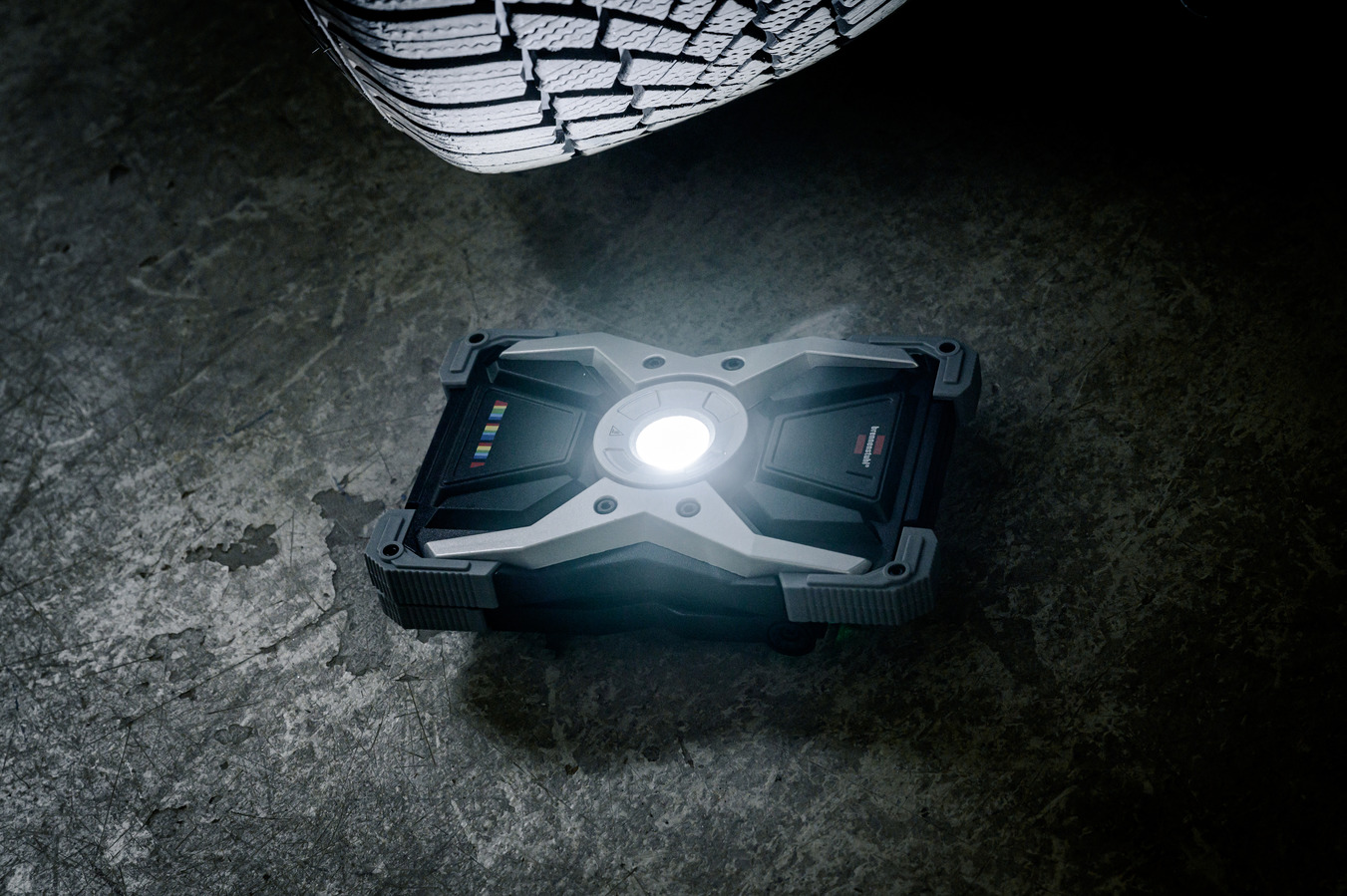 The extremely bright and robust RUFUS LED worklight with IP65 protection (dust and jet-proof) and a very high CRI value is ideal for painting work in workshops, construction sites or in the automotive sector. The high colour rendering index of 15CRI 96 and the ability to switch between several colour temperatures enable accurate assessment of colour quality on various surfaces, for example when matching colours or detecting paint defects. With a housing made of solid die-cast aluminium and additional edge protection made of high-quality plastic, it is suitable for both indoor and outdoor use. The floodlight has a built-in rechargeable battery with a charging time of 5 hours and a memory function that saves all settings. The construction spotlight is charged via the charging interface and with the help of the type A/C charging cable supplied. In addition, the work light convinces with the following features: