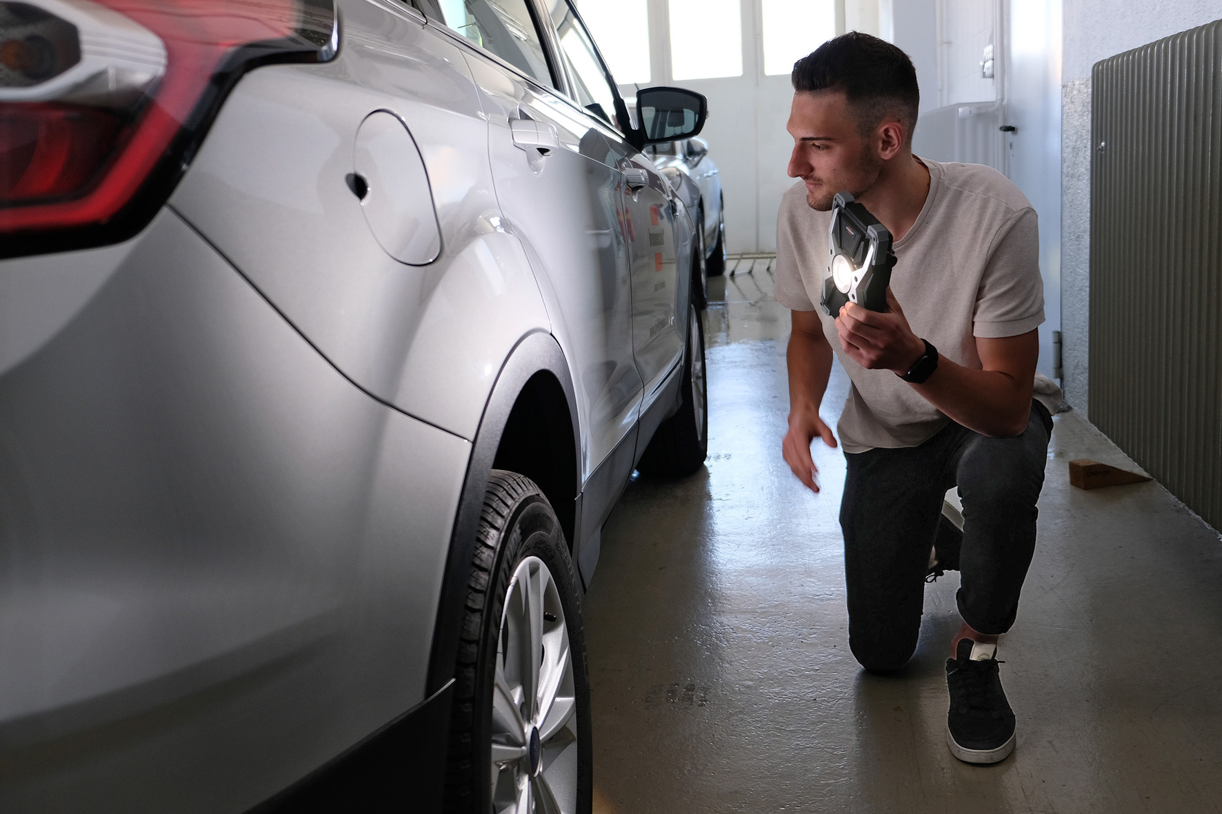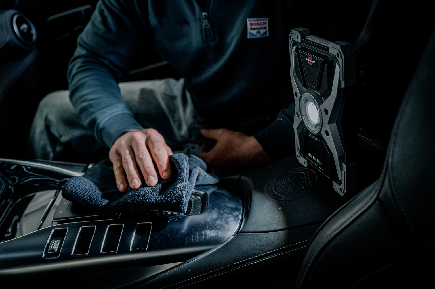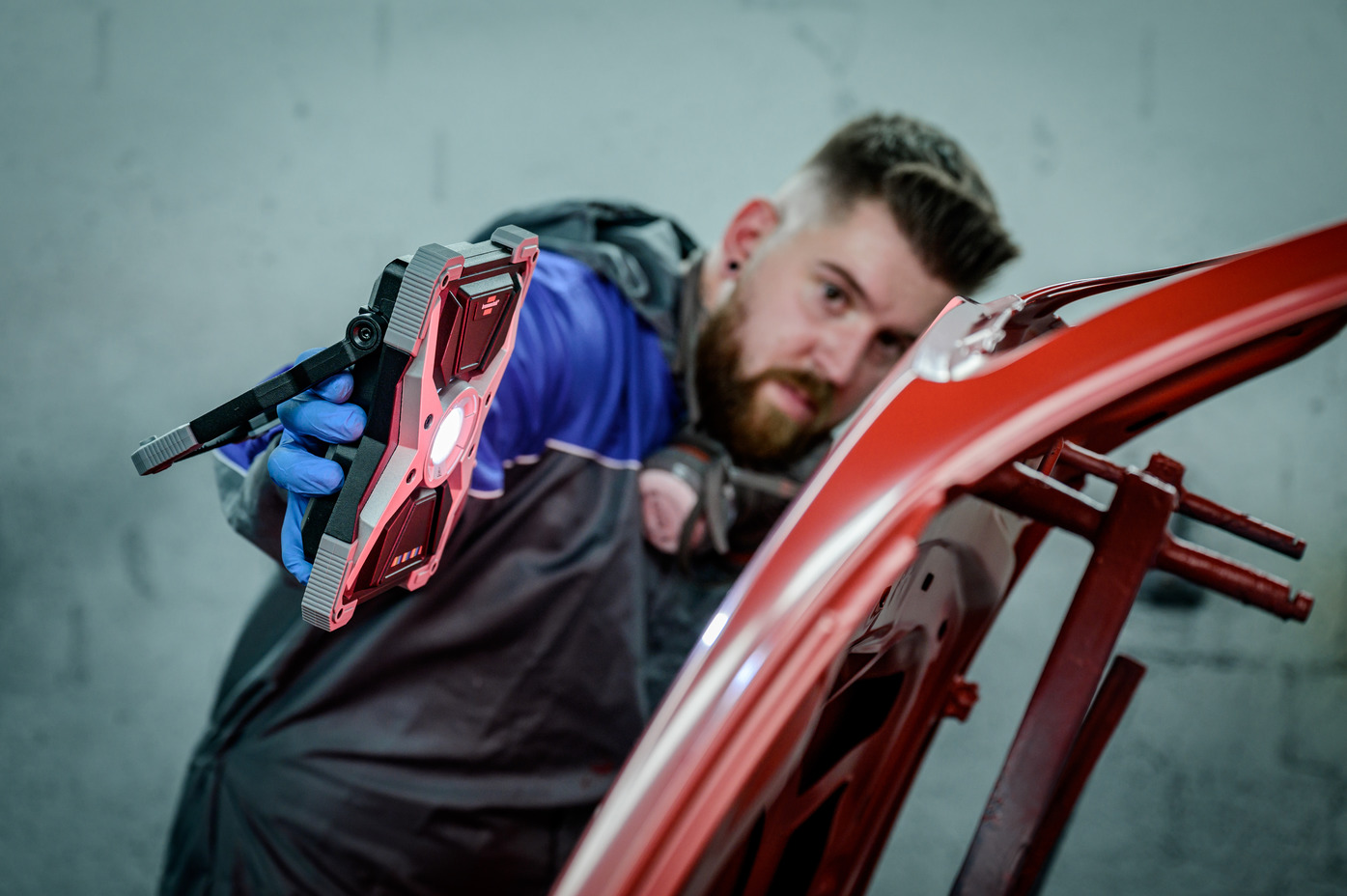 The extremely bright and robust RUFUS LED worklight with IP65 protection (dust and jet-proof) and a very high CRI value is ideal for painting work in workshops, construction sites or in the automotive sector. The high colour rendering index of 15CRI 96 and the ability to switch between several colour temperatures enable accurate assessment of colour quality on various surfaces, for example when matching colours or detecting paint defects. With a housing made of solid die-cast aluminium and additional edge protection made of high-quality plastic, it is suitable for both indoor and outdoor use. The floodlight has a built-in rechargeable battery with a charging time of 5 hours and a memory function that saves all settings. The construction spotlight is charged via the charging interface and with the help of the type A/C charging cable supplied. In addition, the work light convinces with the following features: